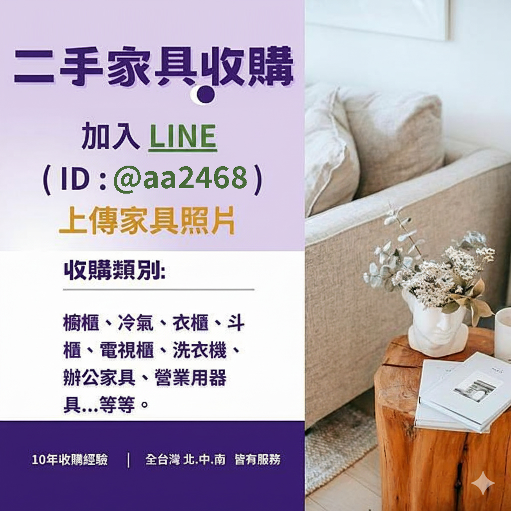 提供全台到府家具家電收購,含冰箱、洗衣機、冷氣與各式家具設備。線上快速估價、免費到府搬運、現場付現金,適合搬家、換屋、店面結束或斷捨離。加入 LINE:@aa2468 上傳照片即可預約。