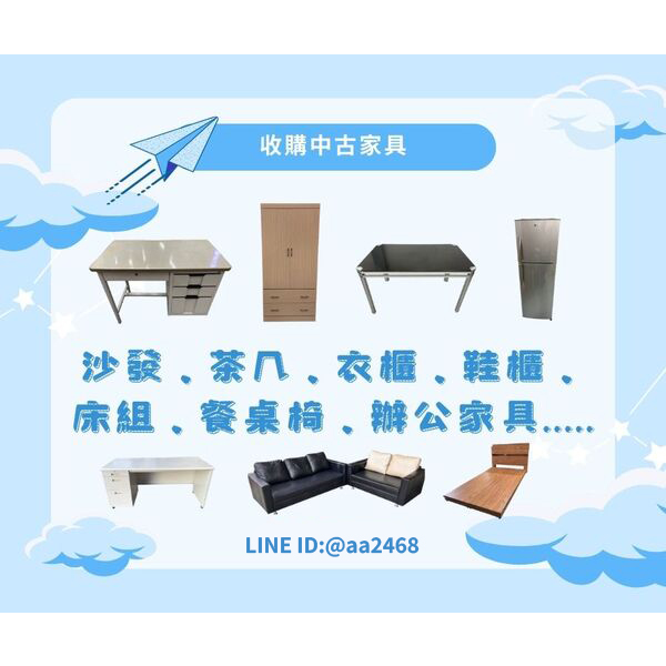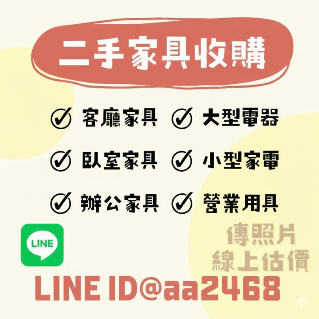 專業中古家具收購與二手家具收購服務,家具回收與家電收購皆可免費線上估價。加入LINE @aa2468 上傳照片即可評估,免搬運費免清潔費,到府服務快速便利,沙發床組冰箱洗衣機冷氣皆可收購。