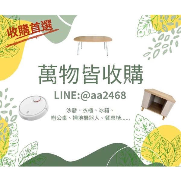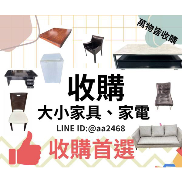 提供萬物皆收購服務,家具、家電、辦公家具與設備皆可到府估價收購。不限品牌、不限數量,專人專車快速處理,加入 LINE @aa2468 立即詢問。