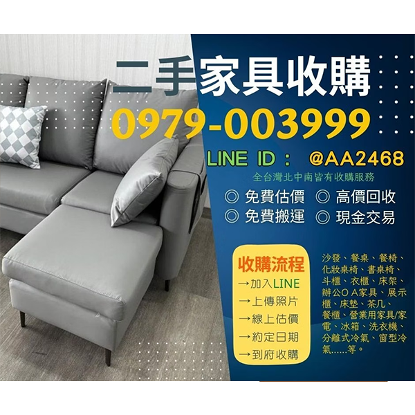 提供全台到府家具家電收購,含冰箱、洗衣機、冷氣與各式家具設備。線上快速估價、免費到府搬運、現場付現金,適合搬家、換屋、店面結束或斷捨離。加入 LINE:@aa2468 上傳照片即可預約。