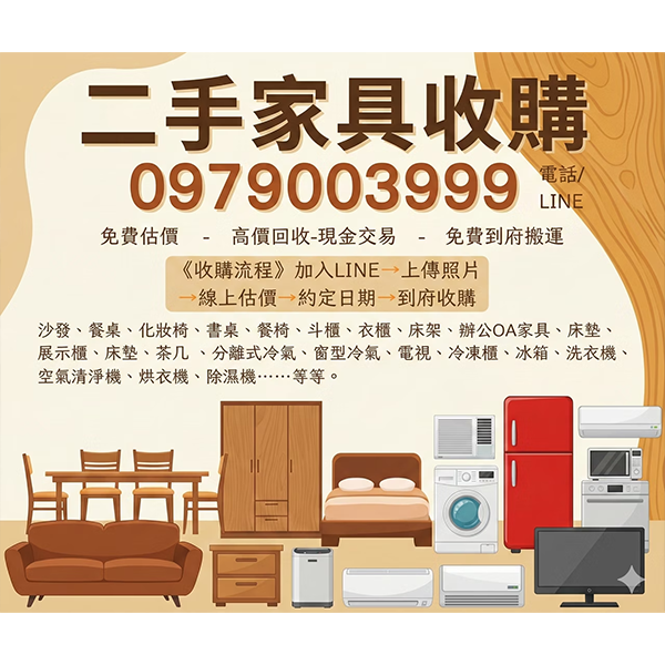 0979003999 二手家具收購,看這裡!想整理家具卻不知道怎麼處理?我們替你把繁瑣變簡單!只要一通電話,專人到府估價,快速、便利、免搬運,輕鬆讓家裡空間重新呼吸。