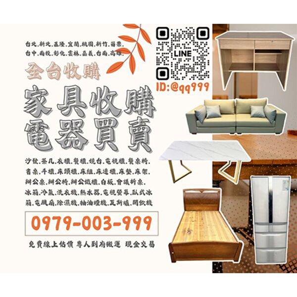 提供全台家具與家電收購服務,免費線上估價、專人到府搬運,安全現金交易最方便!收購各式家具、冷氣、冰箱、洗衣機、電視、實木藝品等,省時又環保。立即洽詢0979-003999或LINE:@qq999