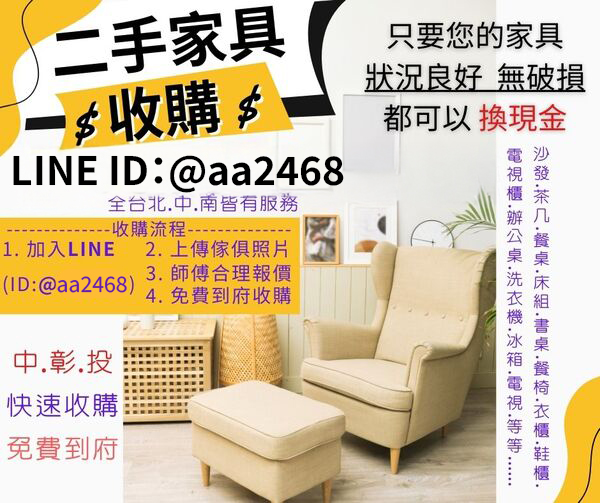 如果你正好符合以上其中一種情況,其實現在就是最適合進行二手家具收購的時機。只要加入 LINE:@aa2468,上傳家具或家電照片,就能快速了解物品價值,讓專業團隊幫你把麻煩一次解決,家裡空間立刻輕鬆許多。