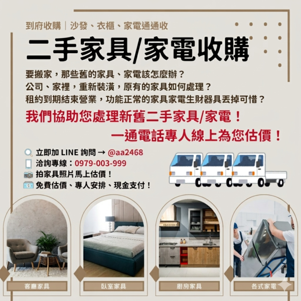 - 第一步:LINE 傳圖即時估價 (LINE ID: @aa2468) 不需要等師傅特地跑一趟!只要拍下家具的正、側面照片,註明品牌與使用狀況(例如:買了兩年、無刮傷、功能正常),訊息傳過來,我們的小編會立刻為你初步報價。這對於急著退租的租屋族來說,簡直是救命稻草!